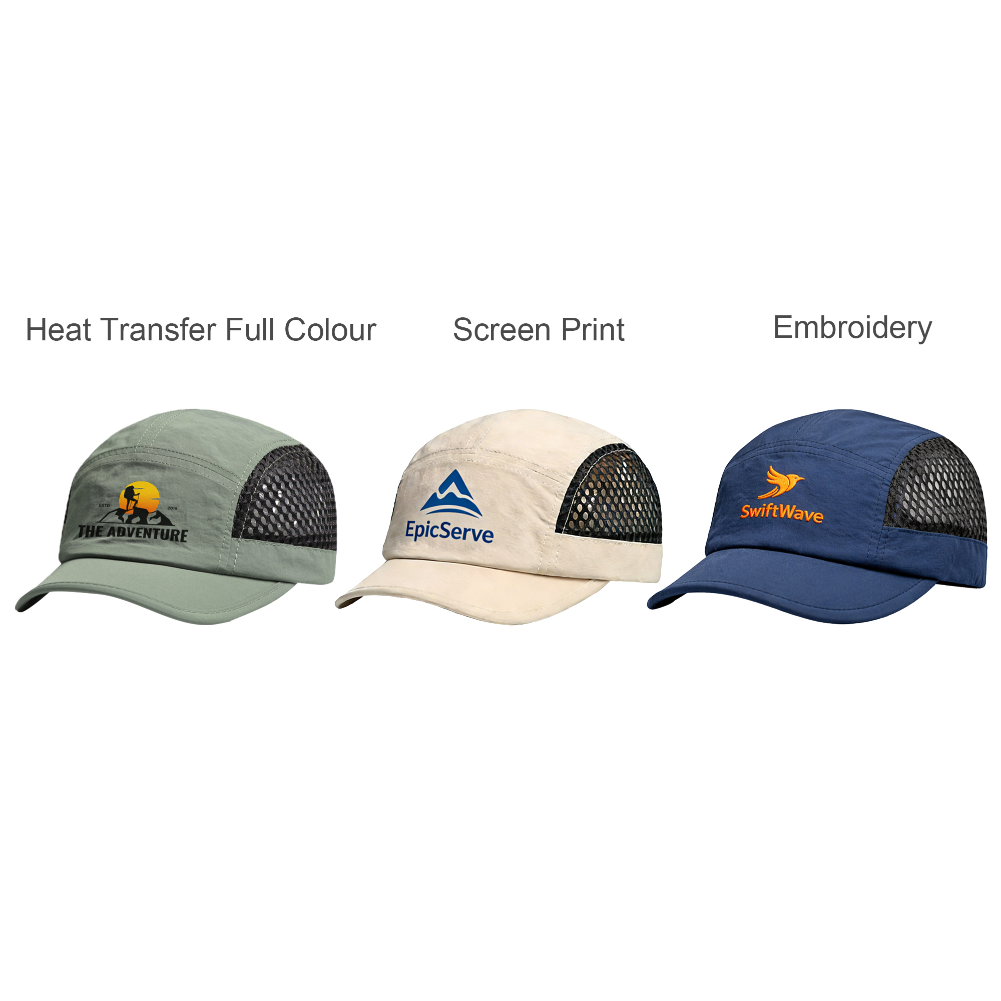 Stay cool and stylish with our Short Brimmed Mesh Running Cap! Made from breathable polyester, this lightweight cap features a 5-panel design for a perfect fit. With heat transfer, screen print, or embroidery to showcase your design, available in various stylish options to match your look. The mesh fabric keeps you cool and comfortable, while the short brim provides sun protection without blocking your view. Whether you're running, hiking, or just out and about, this cap is your go-to accessory for comfort, breathability. Upgrade your sporty style today!. Sizing: Adjustable: 58cm. Materials: Polyester. Price Notes: Please note there may be slight colour variation within batches. Print Position: Front. Price includes: 9week Embroidery. 9week. Setup is included.