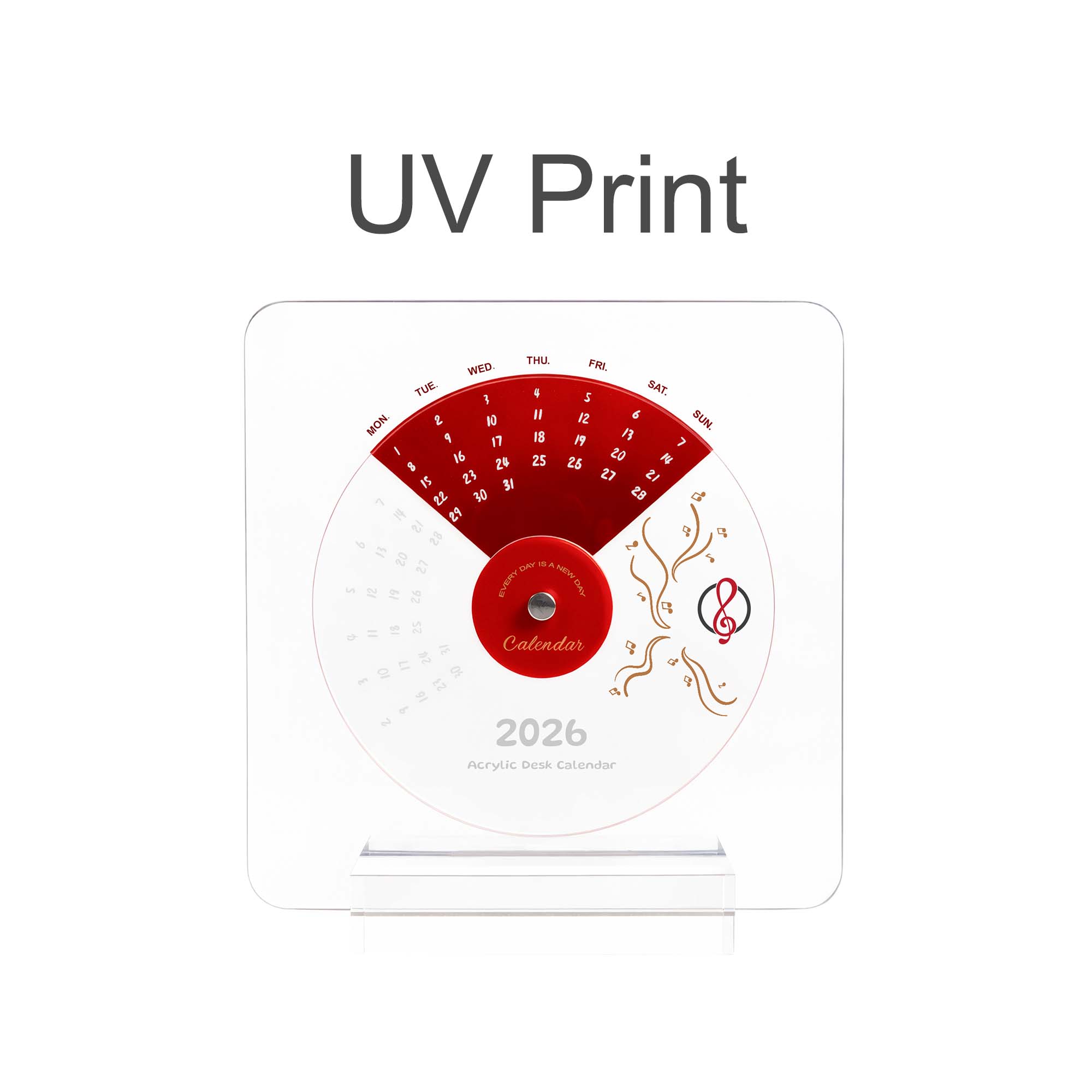Spin your way to better organisation with our Acrylic Desk Calendar! Made from clear, durable acrylic in a fun vinyl record design, this compact calendar fits perfectly on any desk without taking up space. Its unique shape adds a playful touch to your daily planning. Personalise it with UV printing to match your style. Your perfect desk accessory for planning, gifting, and brightening up your workspace!. Sizing: Calendar: 15x15cm Stand base: 9x4.5x2cm. Materials: Acrylic. Print Position: The front of calendar. Price includes: 9week Digital UV Print. 9week. Setup is included.