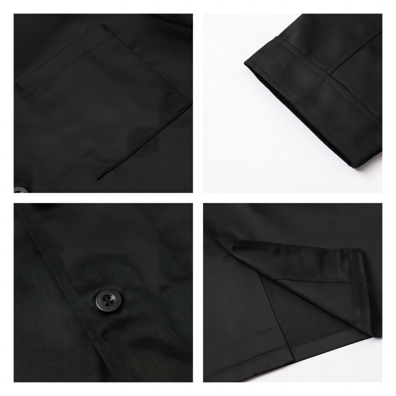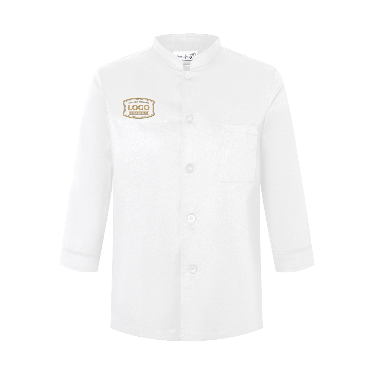 This 3/4 Sleeves single-breasted chef jacket is the classic workwear for restaurants, hotels, and the food industry. Our Choice Chef Jackets are the go-to workwear with all the must-haves like left chest pocket for your most precious tools, sturdy matching buttons, and a single-breasted placket that has you covered from messy spills and stubborn stains. Made of thick twill in 80% polyester for durability and 20% cotton for comfort. Mandarin collar stand with topstitching. We offer different methods to put your brand logo, company name, and slogan by embroidery, full-color heat transfer or customized patch. Do not hesitate to build up your hospitality workwear collection this season!. Sizing: Size S: half chest width = 51cm Body length = 69cm Size M: half chest width = 53cm Body length = 71cm Size L: half chest width = 55cm Body length = 72cmSize XL: half chest width = 57cm Body length = 73cm Size 2XL: half chest width = 59cm Body length = 74cmSize 3XL: half chest width = 61cm Body length = 74cmSize 4XL: half chest width = 63cm Body length = 74cm. Materials: 80% Polyester 20% Cotton Twill, 235gsm. Print Position: Left Chest/Right Chest/Back. Price includes: 4weeks Embroidery. 4weeks. Setup is included.