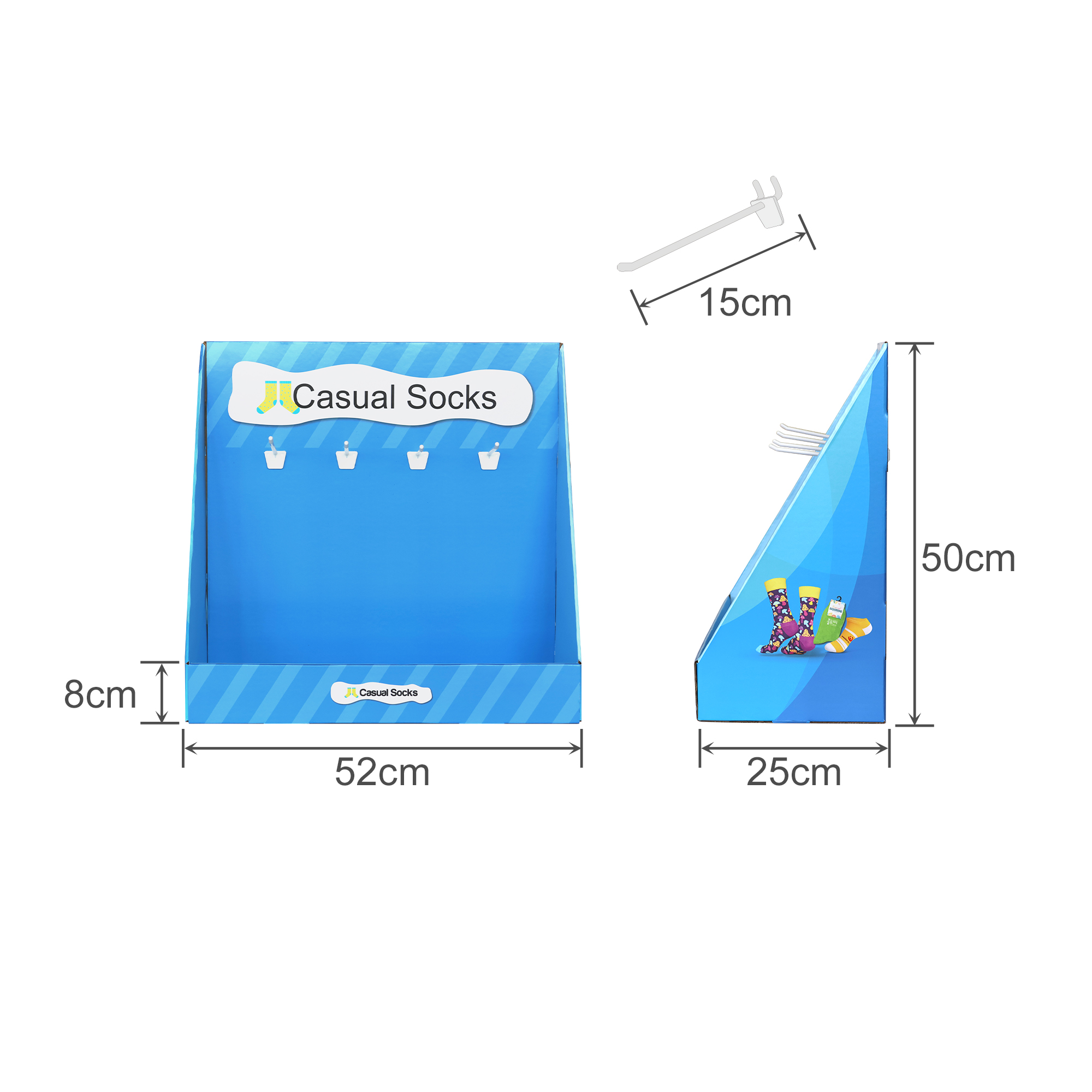 Showcase your products with our Corrugated Cardboard Counter Hooks Display, crafted from sturdy corrugated cardboard. Provide perfect hanging space for items like socks, tools, or small accessories with display hooks. Customised logos or designs through digital printing can enhance the effect of brand promotions. Ideal for retail counters or trade shows, our display offers a practical way for product presentation. Sizing: Display: L50 x W52 x H25cm Hooks Length: 15cm. Materials: Display: Corrugated cardboard (E-flute, 300gsm grey-back board). Hooks: Plastic. Price Notes: Surface glossy or matte finish can be chosen when placing order. Print Position: Front, Back, Left, Right. Price includes: 3week Digital Print. 3week. Setup is included.