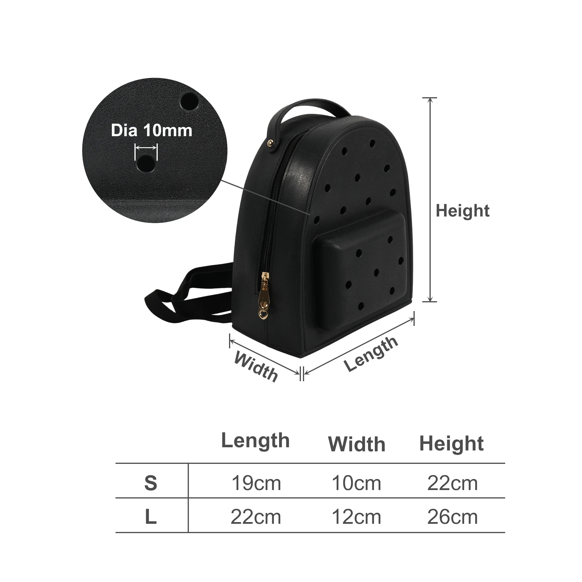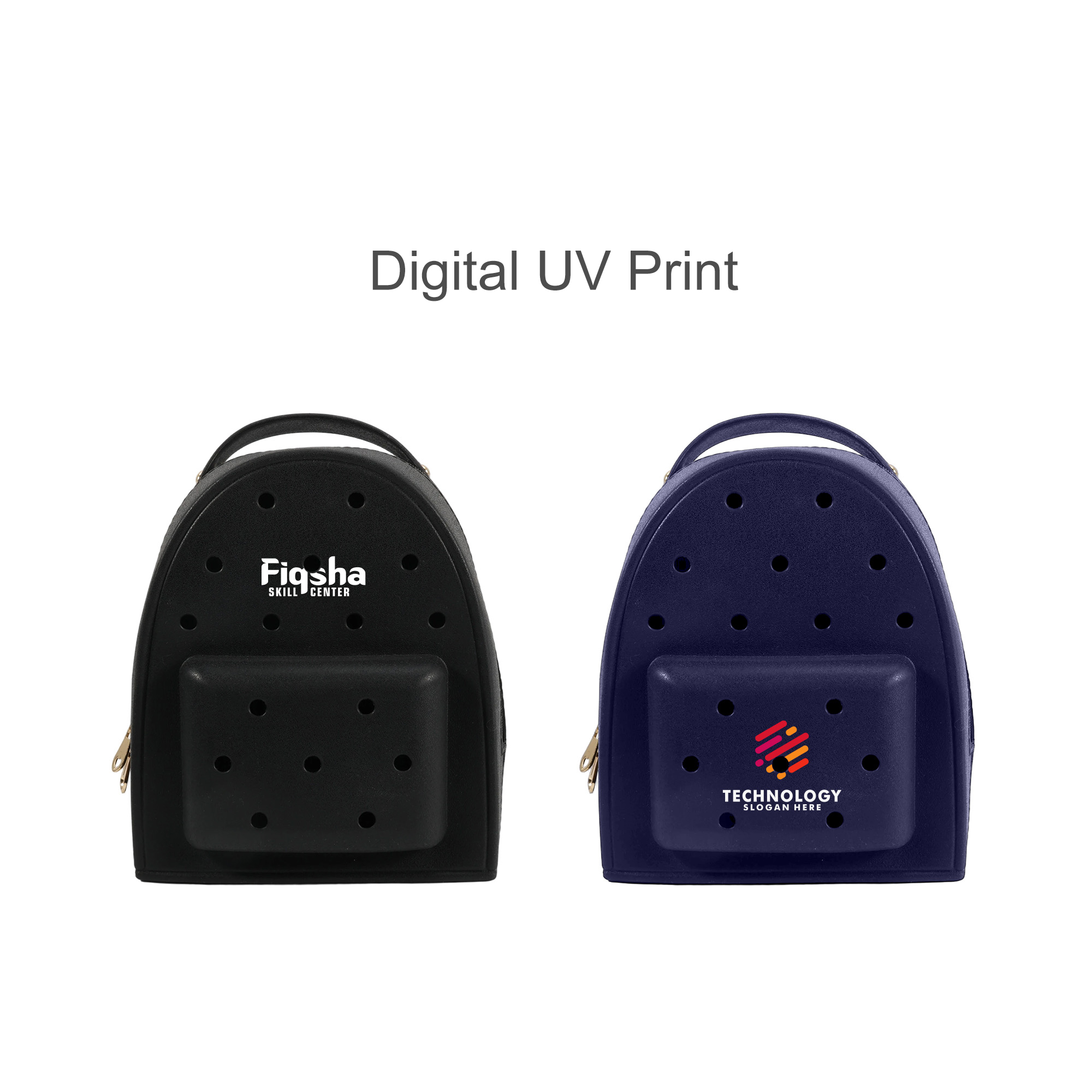 Carry your items in style with our EVA Holes Backpack, featuring an adjustable strap from 42cm to 70cm for comfortable use. Crafted from lightweight and waterproof EVA material, our bag is available in 8 colours to match your style. Personalise the bag through Screen printing or Digital UV printing to showcase your logos or brand messages. Additional customisations include custom shape charms and a custom backing card. Ideal for school use, day trips, or outdoor activities, our bag presents your brand through practical carrying solutions. Sizing: S: 19x10x22cm L: 22x12x26cm Strap Length: 42 70cm. Materials: EVA. Price Notes: PMS Matching is available for quantities over 500pcs, please contact us for extra cost when placing the order. The maximum loading weight is about 5kg. The colour of the shoulder strap will be roughly matched to the colour of the EVA bag. Print Position: Top Bottom. Price includes: 7week Digital UV Full Colour. 7week. Setup is included.