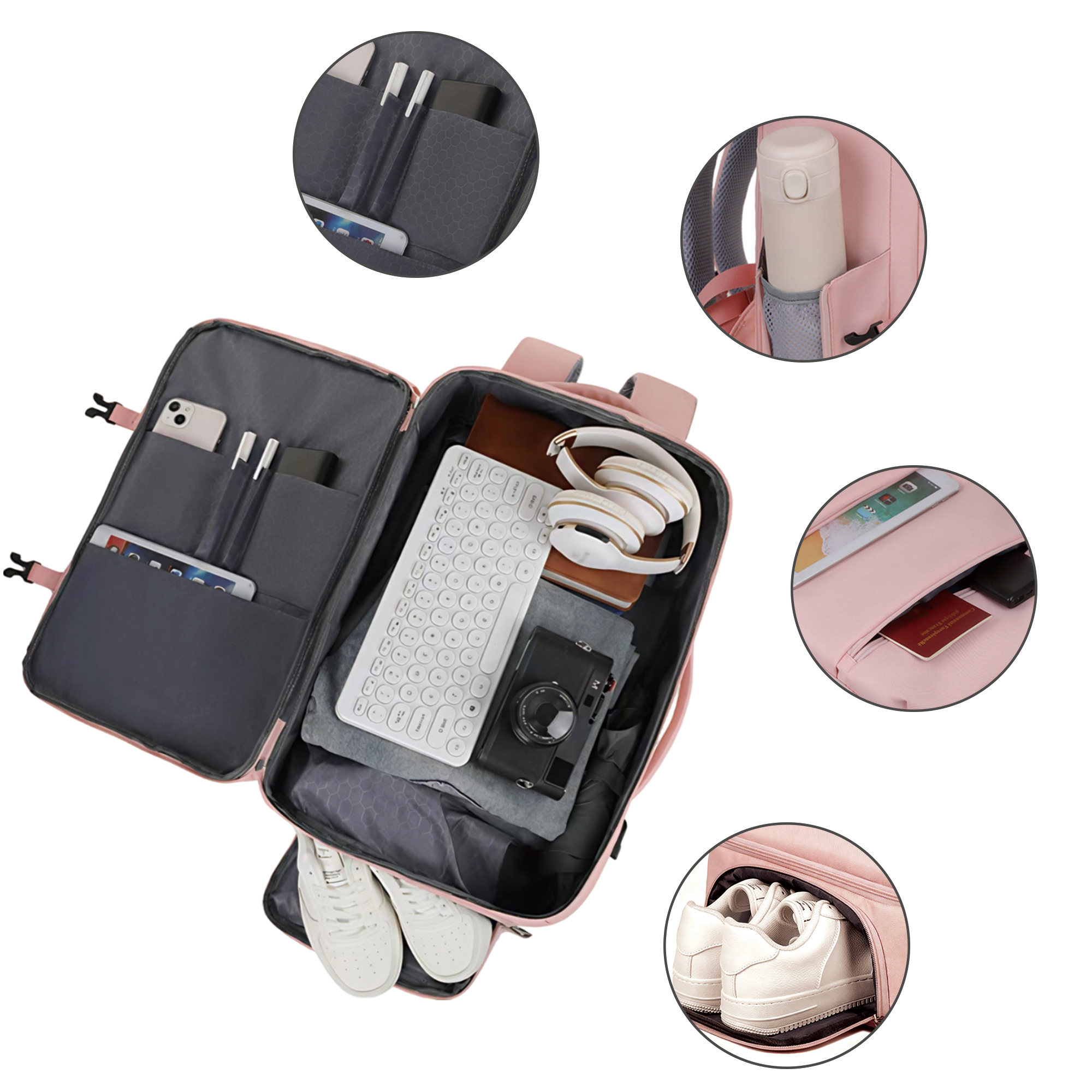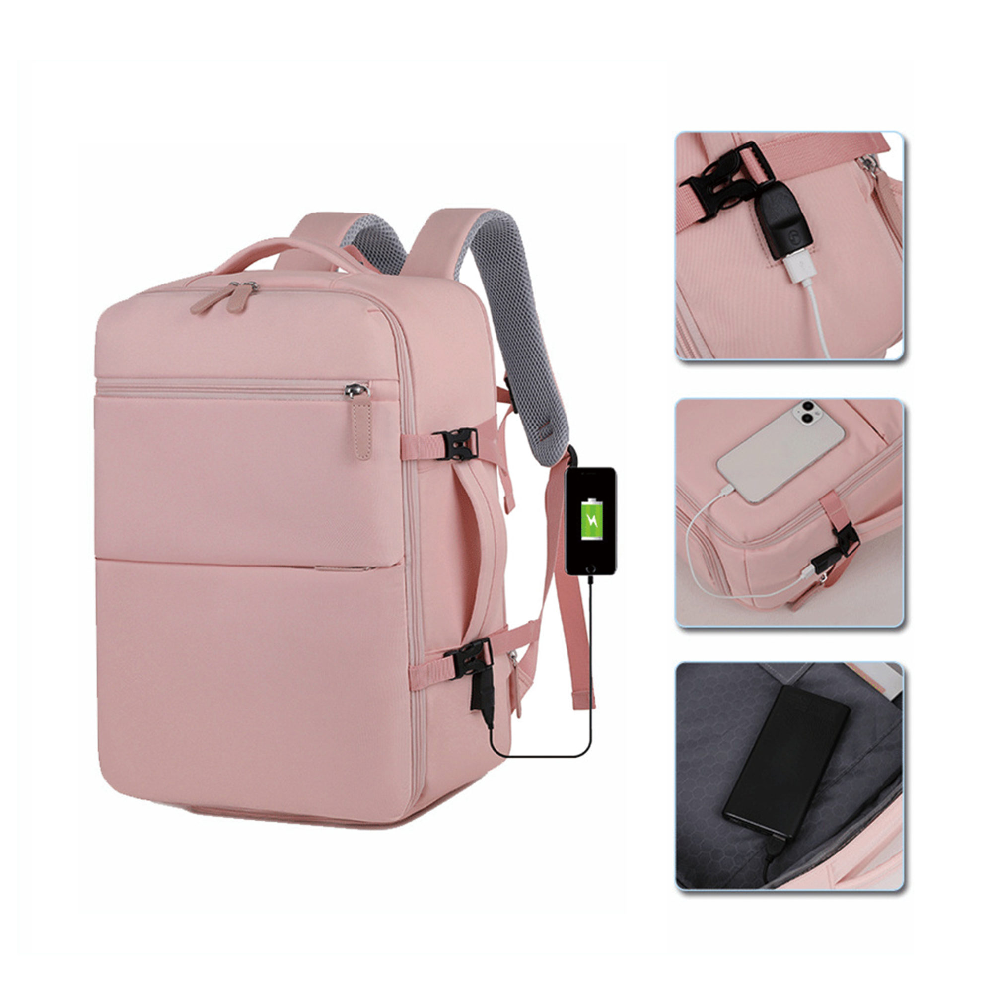 This Expandable Travel Backpack is the perfect travel companion which fits up to your 16" laptop with expandable capacity, featuring 2 front zipper pockets for essentials, a side pocket for bottle, a bottom bag for shoes and a main pocket with USB charging. Our quality backpack is made of Oxford material, that is water resistant and durable. With full colour heat transfer to showcase your design, you can choose from 5 colours. Sizing: Unexpanded:32cm w 45cm h 17cm d Expanded: 32cm w 45cm h 23cm d (Can fit up to 16" laptop or less (Shoes pocket can fit 2 pairs of shoes in Size 42 with a length of 27 cm or less. Materials: Oxford material. Print Position: Front. Price includes: 2week Heat Transfer Full Colour. 2week. Setup is included.