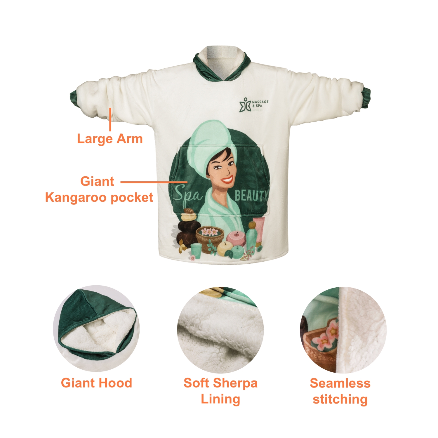 Hit the market with Our Fully Sublimated Wearable Blanket. Great to snuggle into during the colder months. These wearable blankets are made out of double sided Ultra Soft Blanket material, with 180 gsm Flannel Fleece outer, and 180gsm Plush Sherpa for inner lining. The wearable blanket is designed to be reversible. With a deep hood, larger kangaroo pocket front, and oversize length for the body and sleeves. Whether for lounging, reading or enjoying sporting events at home or outdoor for camping, it s the perfect choice. Sizing: Free size Kids: Chest width = 156 Body length = 84cm Bottom width = 160 Sleeve length = 53cmThis kids wearable blanket is designed for children aged from 6 to 16 years old. Due to the elasticity of the fabric, the tolerance of the actual measurement is within 5cm. Materials: Shell: 180gsm Jersey Flannel Lining: 180gsm Plush Sherpa. Price Notes: For sublimation style, MOQ refers to minimum order quantity per design. For sizing guide, please refer to our sizing chart slide in the product images. Price includes: 4week Apparel Sublimation. 4week. Setup is included.