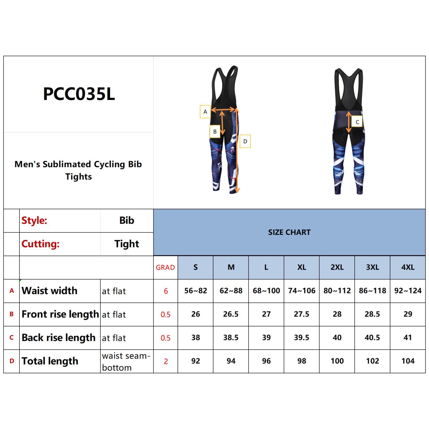 Break your riding record with our Cycling Bib Tights. Our Cycling Bib Tights are made of poly spandex, with nylon spandex in the crotch and mesh for the straps. Featuring materials that are both Quick Dry, Breathable, Anti-sweat and Anti-Wrinkle. Poly spandex offers extra comfort and freedom of movement. Its moisture management properties make it resistant to sweat stains. Nylon spandex offers increased structure and durability. Mesh offers a super lightweight feel and heightened comfort. Leg hems feature Silicone Gripper Tape to secure bibs in place. Create the excellent cycling suit for your team right now! We will work with you to create the perfect design for your team. Sizing: Size S: waist=56 82cm Total length=92cm Size M: waist=62 88cm Total length=94cmSize L: waist=68 100cm Total length=96cmSize XL: waist=74 106cm Total length=96cmSize 2XL: waist=80 112cm Total length=100cmSize 3XL: waist=86 118cm Total length=102cmSize 4XL: waist=92 124cm Total length=104cm. Materials: 250gsm Lycra (80% Polyester 20% Elastane). Price Notes: For sublimation style, MOQ refers to minimum order quantity per design. For Cycling Jersey, please refer to product PCC024 short sleeves or PCC026 long sleeves. For sizing guide, please refer to our sizing chart slide in the product images. Price includes: 4week Apparel Sublimation. 4week. Setup is included.