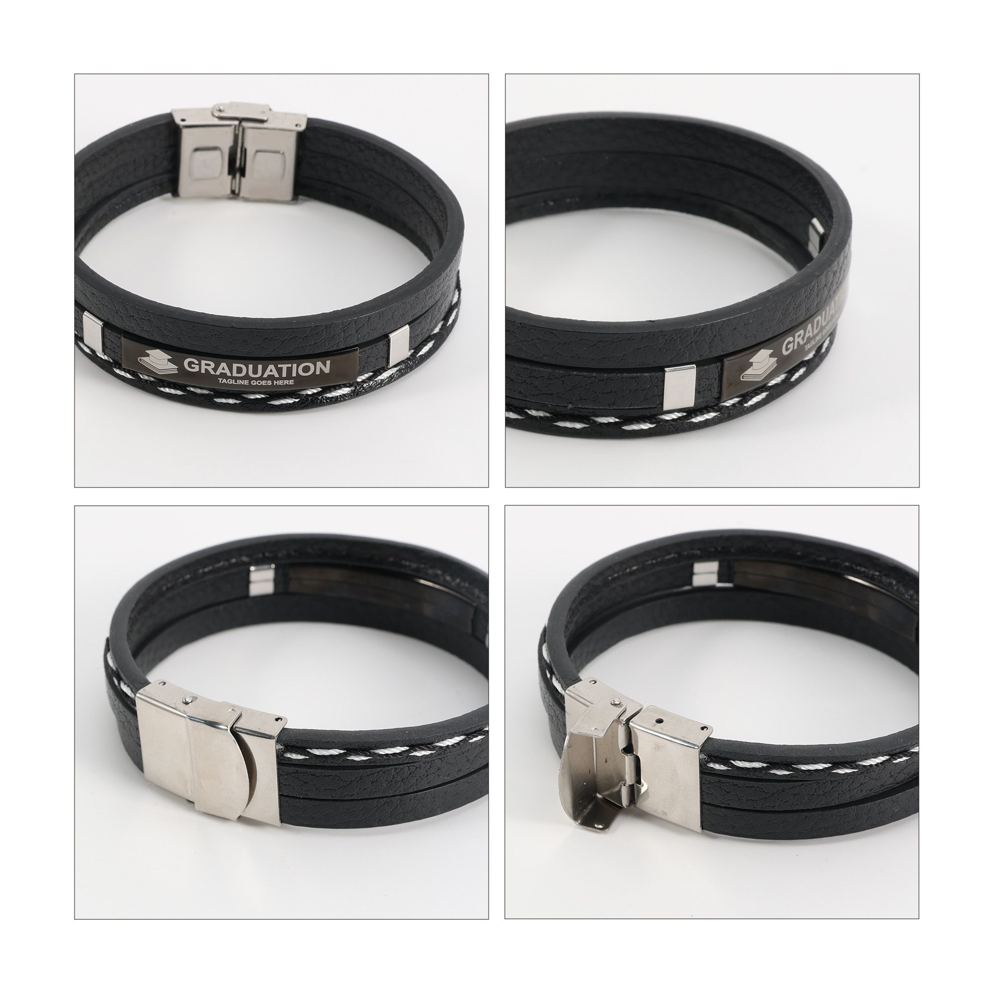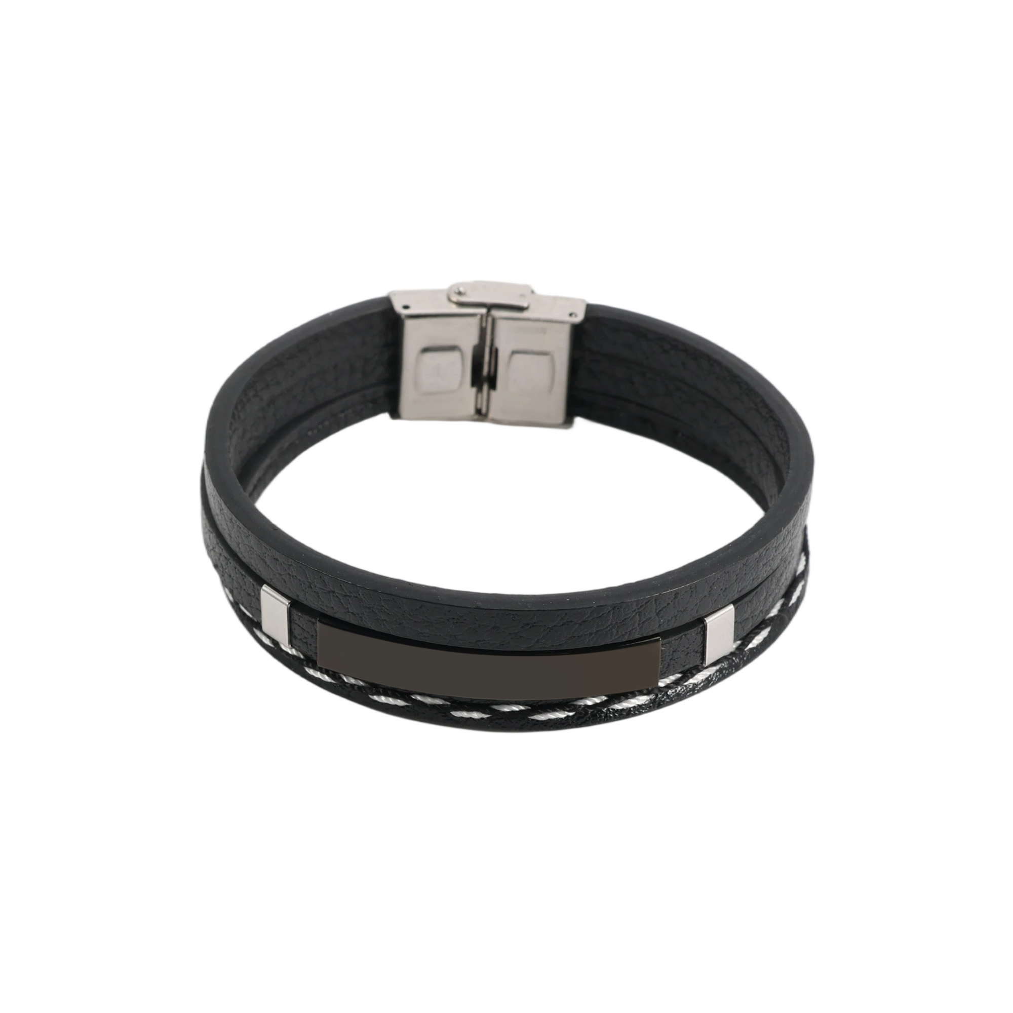 Promote your brand with our Multi-layer Braided Leather Bracelet, crafted from high-quality leather and metal. Featuring a classic hook buckle and three leather straps and with a metal arc in silver, black or gold, our bracelet offers both fashion and durability. Personalise through engraving to display your logos or brand messages clearly. Suitable for daily wear, promotional events, or brand campaigns, our bracelet delivers both style and effective brand visibility. Sizing: Leather bracelet: L220 x W18mm Metal: L39 x W7mm. Materials: Leather, Metal. Print Position: Metal. Price includes: 4week Engraving. 4week. Setup is included.