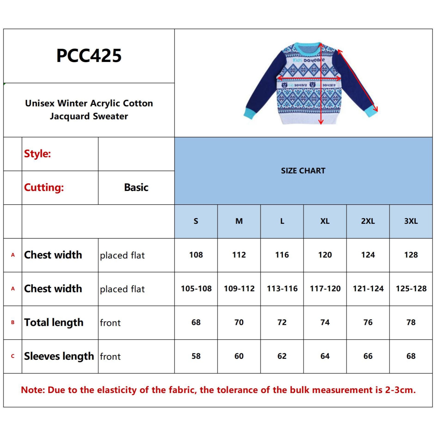 This Unisex Acrylic Cotton Jacquard Sweater is the best way to get your branding seen. Made from 55% Acrylic, 45% Cotton, medium weight 7GG knitting. The material is both soft, comfortable and durable. The 7GG knitting is looser but thicker than the 12GG because the yarn is thicker. Customization available through jacquard craft, where the whole garment can be customized, to enhance the effect of brand promotions. Perfect for school uniforms, work wear or any promotion. Sizing: Size S: chest width = 105-108cm Total length = 68cm Size M: chest width = 109-112cm Total length = 70cm Size L: chest width = 113-116cm Total length =72cm Size XL: chest width = 117-120cm Total length = 74cm Size 2XL: chest width = 121-124cm Total length = 76cm Size 3XL: chest width = 125-128cm Total length = 78cm. Materials: 55% Acrylic, 45% Cotton, 7GG. Price Notes: For sizing guide, please refer to our sizing chart slide in the product images. Price includes: 5week Jacquard craft. 5week. Setup is included.