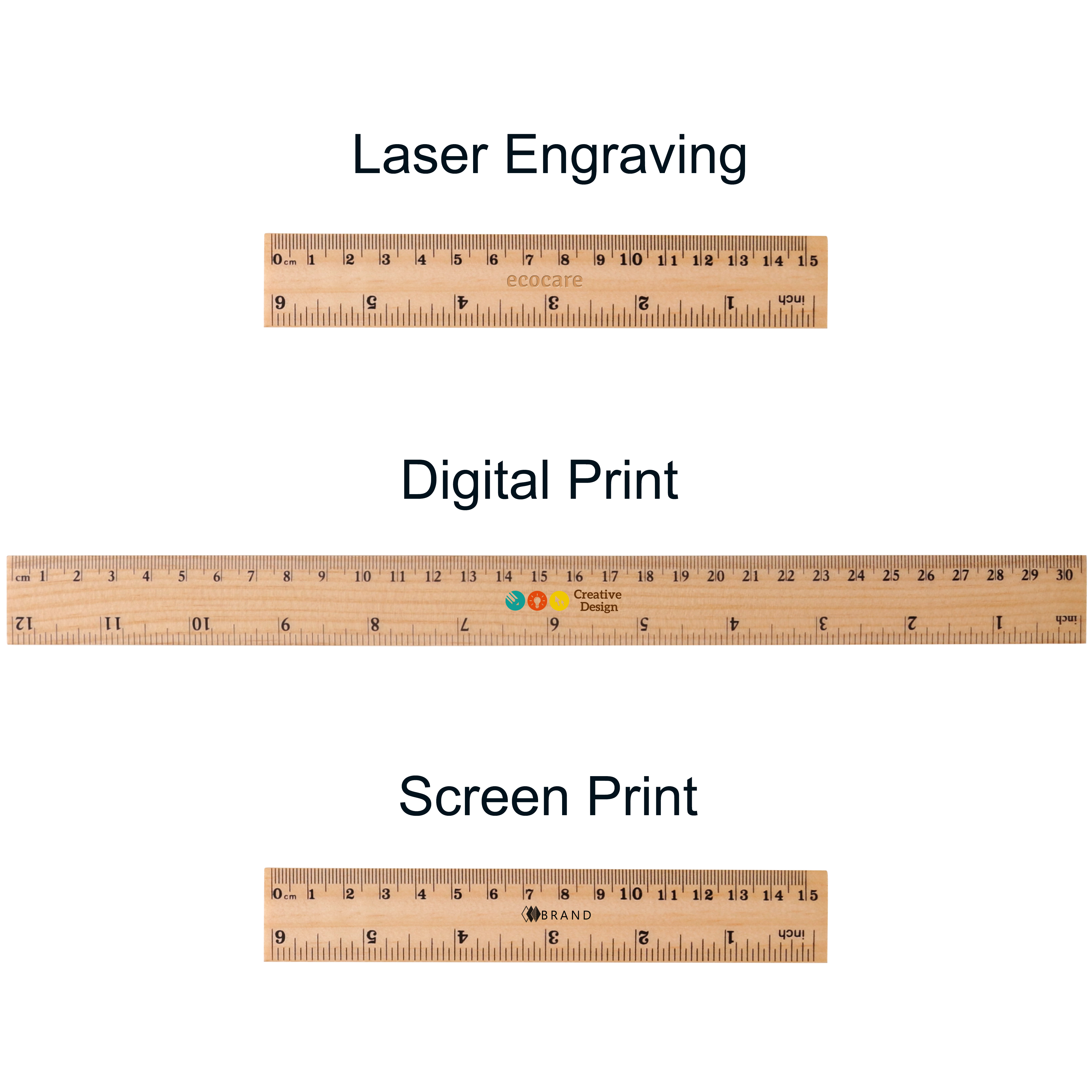Promote your business with our new Dual Scale Wooden Ruler! These rulers are made of wood, which is eco-friendly and sustainable. Screen print, laser engraving, and UV print of your logo on the center is available. These rulers are great for school and office use, featuring an accurate black ink printed scale of 6"/8'' and 15cm/30cm. Customize your logo on these rulers get your business promoted!. Sizing: 15CM - 158mm 25mm 3mm(Length Width Thickness)30CM - 310mm 25mm 3mm(Length Width Thickness). Materials: Wood. Price Notes:. Price includes: 3week Engraving. 3week. Setup is included.