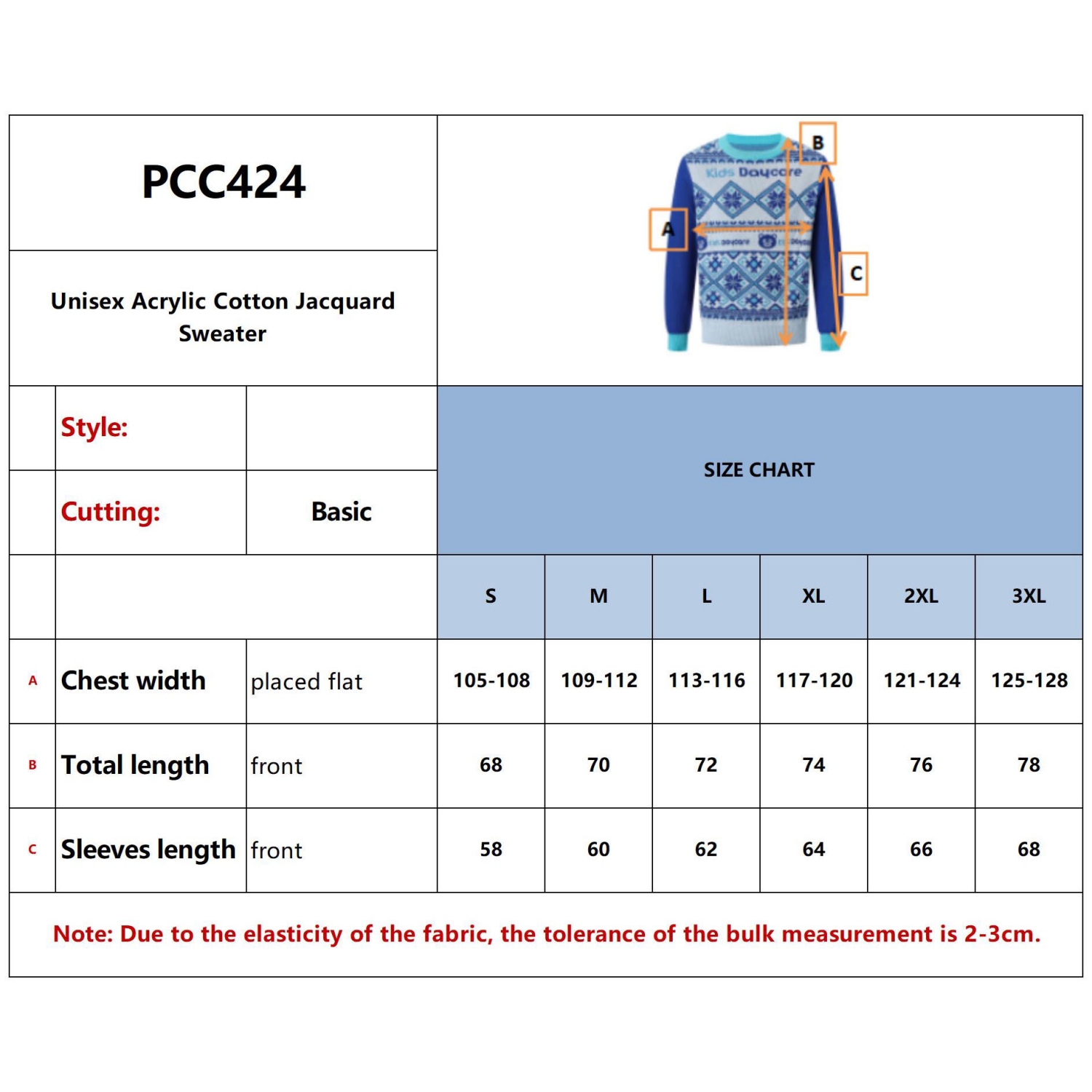 This Unisex Acrylic Cotton Jacquard Sweater is the best way to get your branding seen. Made from 55% Acrylic, 45% Cotton, lightweight 12GG knitting. The material is both soft, comfortable and durable, perfect for year round wear. 12GG has better performance on the details of jacquard patterns compared with 7GG. Customization available through jacquard craft, where the whole garment can be customized, to enhance the effect of brand promotions. Perfect?for?school?uniforms,?work?wear?or any promotion. Sizing: Size S: chest width = 105-108cm Total length = 68cm Size M: chest width = 109-112cm Total length = 70cm Size L: chest width = 113-116cm Total length =72cm Size XL: chest width = 117-120cm Total length = 74cm Size 2XL: chest width = 121-124cm Total length = 76cm Size 3XL: chest width = 125-128cm Total length = 78cm. Materials: 55% Acrylic, 45% Cotton 12GG. Price Notes: For sizing guide, please refer to our sizing chart slide in the product images. Price includes: 5week Jacquard craft. 5week. Setup is included.